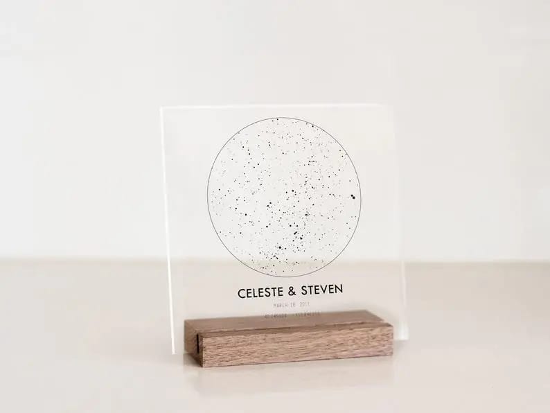 Printed on premium acrylic and paired with a solid wooden stand, this star chart makes a meaningful and timeless gift for your partner, family, or friends.